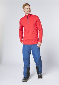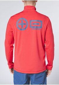 Rote Langarmjacke mit hohem Kragen und blauen grafischen Symbolen auf der Rückseite. Verfügt über eine glatte Textur und ein figurbetontes Design.