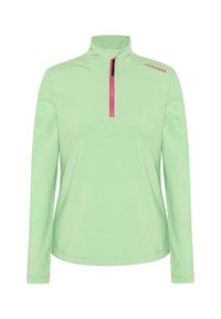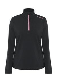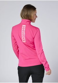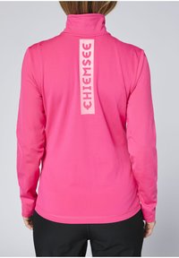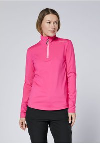 Eng anliegendes Sportoberteil mit langen Ärmeln in leuchtendem Pink, mit einem halben Reißverschluss und einem hohen Kragen. Der Stoff wirkt glatt mit mattem Finish.
