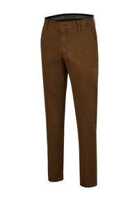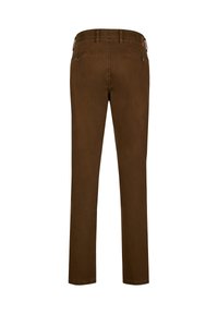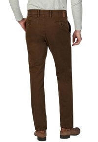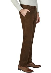 Braune Chinos mit geradem Bein, aus einem weichen Baumwollmischgewebe gefertigt. Verfügt überfronttaschen und einen Knopfverschluss. Reiche, strukturierte Oberfläche.