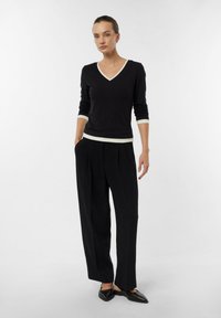 Frau trägt schwarzen langärmeligen V-Ausschnitt-Pullover mit weißem Besatz an Ausschnitt, Bündchen und Saum, kombiniert mit schwarzen plissierten Hosen, steht vor weißem Hintergrund.