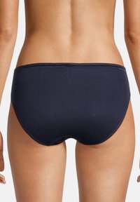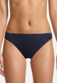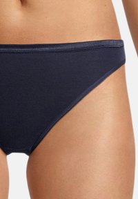 Weißes Bustier mit dünnen Trägern und einem navy-blauen Bikini-Oberteil. Glattes Material, einfaches Design und angenehme Passform.