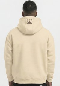 Beiger Kapuzenpullover mit gesticktem "Dada"-Schriftzug in Braun. Verfügt über eine Fronttasche und eine Reißverschlusstasche am Ärmel. Weicher Stoff und lockere Passform.
