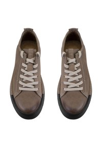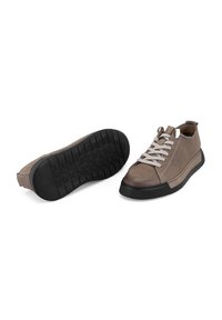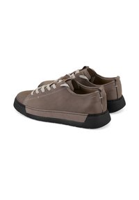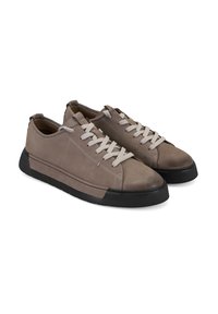 Hellgraue Wildledersneaker mit abgerundetem Zehenbereich, cremfarbenen Schnürsenkeln und schwarzem Gummisohle. Mit tonal abgestimmten Nähten und minimalistischen Designelementen.