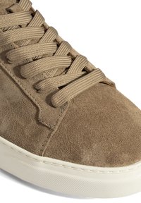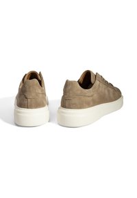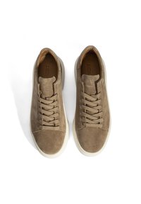 Brauner Wildleder-Sneaker mit flacher Sohle aus beigem Gummi und passenden braunen Schnürsenkeln, seitlich auf weißem Hintergrund dargestellt.
