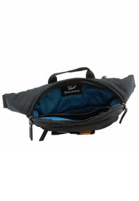 Schwarze Stoffgürteltasche mit mehreren Reißverschlussfächern, einem blauen Akzentband und einem Patch-Logo. Kompaktes Design mit einem robusten Griff.