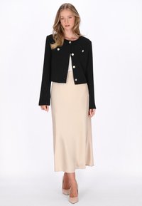 Blonde Frau trägt eine schwarze Jacke mit goldenen Knöpfen und einen beigen Rock, steht vor einem schlichten weißen Hintergrund.
