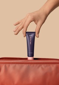 Schraube den Deckel ab und drücke auf die Tube, um eine Dosis in deine Handfläche abzugeben.