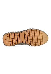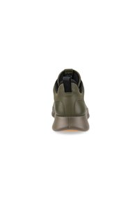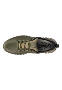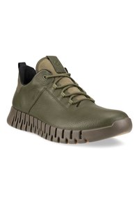 Olivgrüne Leder-Sneaker mit strukturiertem Finish, Schnürdesign und flexibler Gummisohle mit ausgeprägten Rillen für besseren Halt.