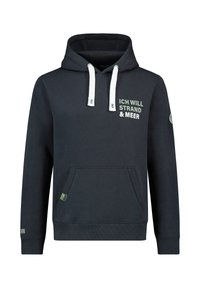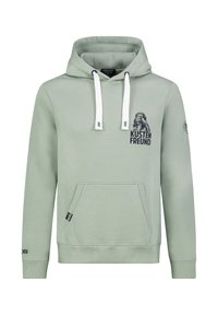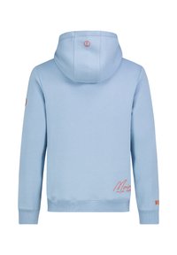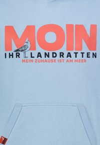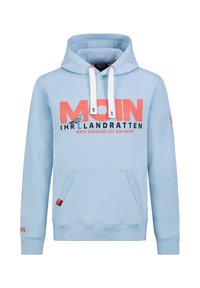 Hellblauer Hoodie aus weichem Stoff, mit einer Kängurutasche vorne, einem Kapuzenzug und kräftigem, grafischem Text in Rot und Schwarz. Mit einer Akzent-Vogel-Illustration.