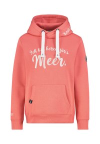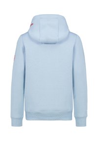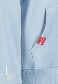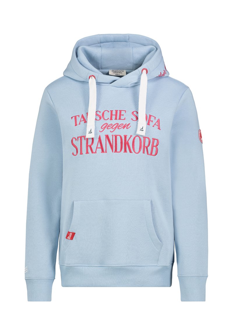 Hellblauer Hoodie mit weißen Kordeln, Fronttasche und rotem Aufdruck. Hergestellt aus weichem Stoff mit gerippten Bündchen. Logo auf dem Ärmel.