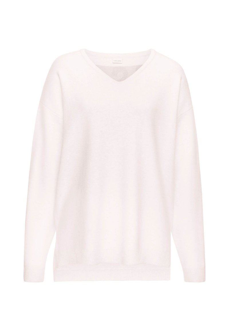 Weißer Strickpullover mit V-Ausschnitt, überschnittenen Schultern und Rippbündchen. Sanfte Textur und gemütlicher Schnitt, mit minimalistischen Designdetails.