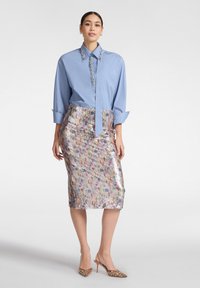 Hellblaue Bluse mit Kragen und dekorativen floralen Perlenverzierungen, kombiniert mit einem glänzenden, mehrfarbigen, mit Pailletten besetzten Rock.