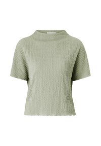 Hellbeige strukturierte Bluse mit lockerer Passform, kurzen Ärmeln und einem scallopiertem Saum, kombiniert mit dunkelblauen Jeans.