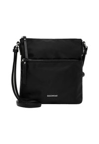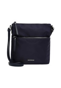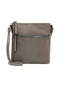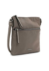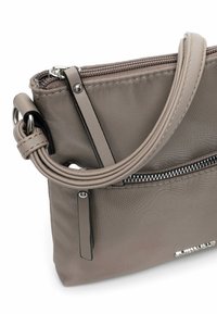 Taupefarbene Umhängetasche mit verstellbarem Riemen, vorderer Reißverschlusstasche und silbernem Emily & Noah Logo auf glattem Stoff.