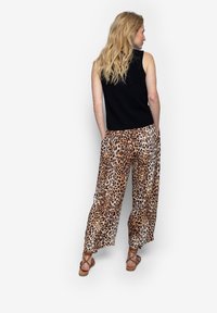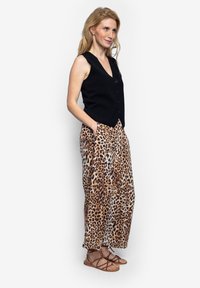 Frau mit langen blonden Haaren, die eine ärmellose schwarze Weste mit Knöpfen, weite Hose mit Leopardenmuster und braune Riemchensandalen trägt, steht mit den Händen in den Taschen.