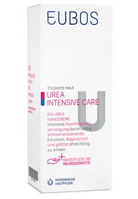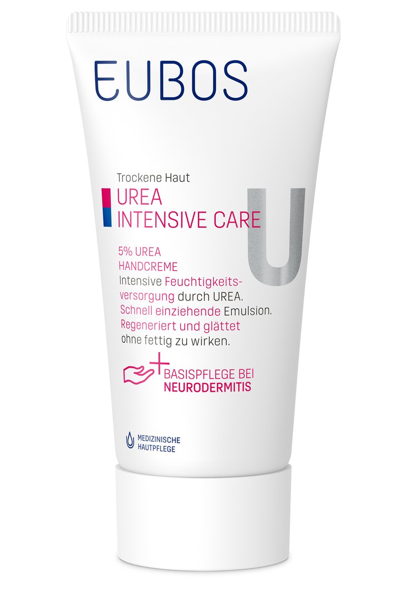 UREA INTENSIVE CARE 5% HANDCREME. Medizinisches Pflegeprodukt für trockene Haut. 5% Urea plus Glycerin erhöhen die Hydration D-Panthenol, Vitamin E und Allantoin verbessern das Feuchthaltevermögen. Vitamin B3 stärkt die hauteigene Barriere, fördert die Hauterneuerung. Shéa-Butter und ausgesuchte Esteröle spenden Lipide und pflegen gereizte Haut. Die komplette UREA INTENSIVE CARE Serie ist für die wirkungsvolle Pflege trockener Haut geeignet. Auch Therapie begleitend, z. B. bei Neurodermitis und Psoriasis