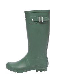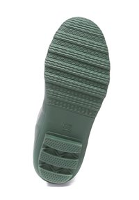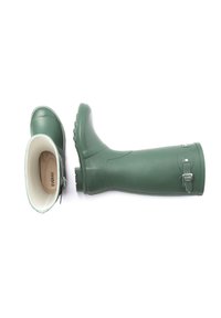 Grüner Gummiregenstiefel mit runder Spitze, strukturiertem Obermaterial und goldfarbenem Schnallen-Detail an der Seite. Profilierte Sohle mit definierten Rillen.