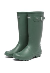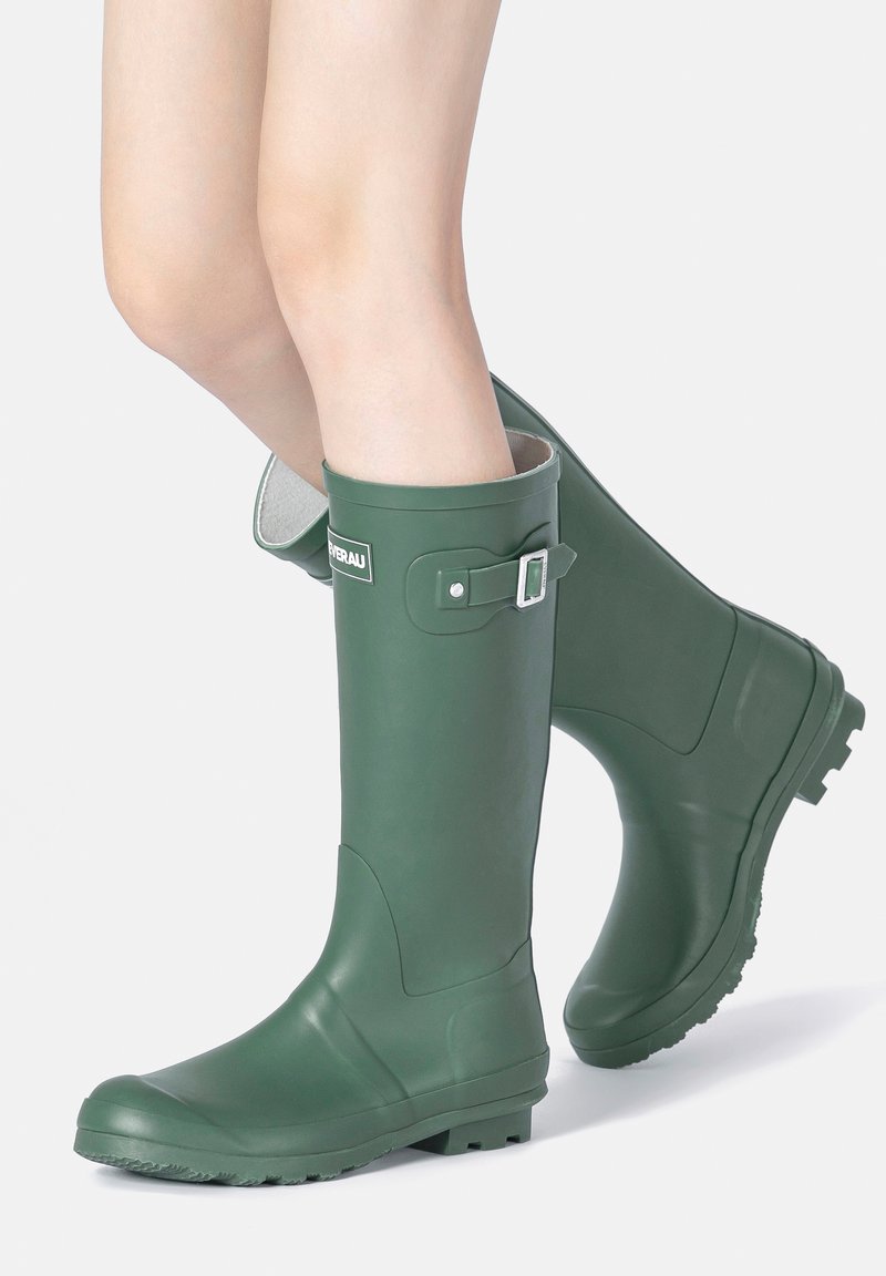 Grüne Gummiregenstiefel mit einer Höhe bis zur Mitte der Waden, strukturierten Sohlen und einem seitlichen Schnallen-Detail. Glatte Oberfläche und ein fester Sitz um den Knöchel.