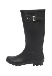 Schwarzer Gummistiefel mit strukturiertem Finish, runder Zehenpartie und Schnallenakzent. Mit einem Karo-Muster gefüttert. Profilierte Sohle für besseren Halt.