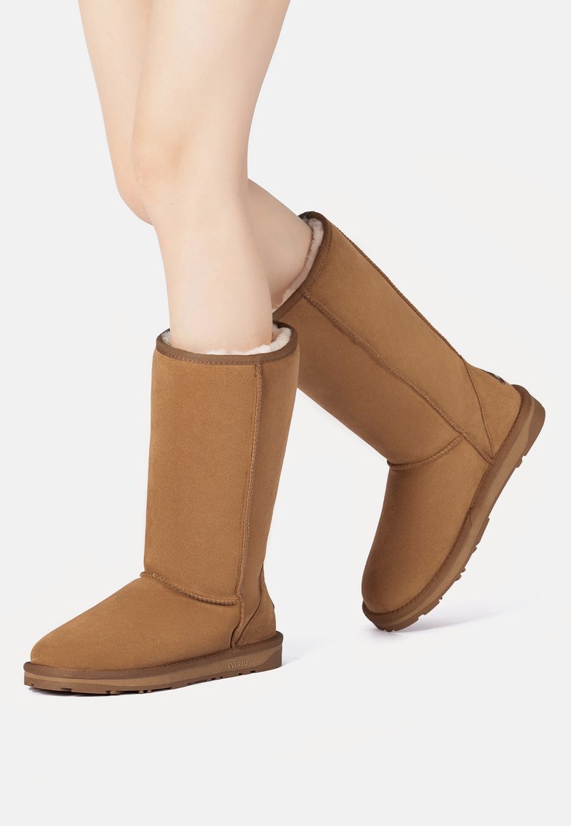 Braune kniehoche Stiefel mit einer weichen, strukturierten Oberfläche, abgerundeter Zehenpartie und gefüttertem Innenleben. Gummisohle für besseren Halt.