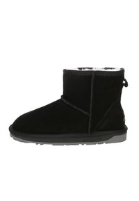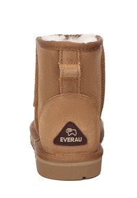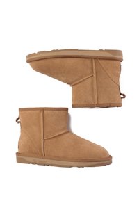 Beige Stiefelette aus weichem Wildledermaterial, mit runder Zehenpartie, Lammfellfutter und Gummisohle mit Zuglasche.