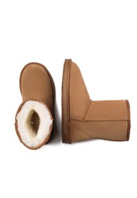 Braune Wildleder-Ankle Boots mit runder Zehenpartie, weichem weißen Futter und flacher Gummisohle. Mit sichtbaren Nähten und einem Logodetail an der Seite.