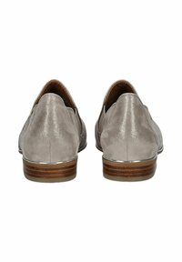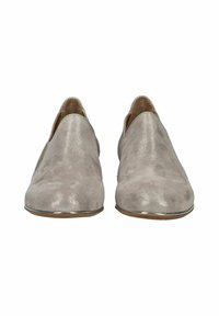 Bequemer Slipper in Hellgrau, gefertigt aus einem glatten, strukturierten Obermaterial. Verfügt über elastische Seitenpaneele und einen niedrigen Holzabsatz für Stabilität.