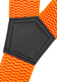Helle orange gewebte Hosenträger mit schwarzen Leder-Patches und silbernen Metall-Clips, angeordnet in Form eines M auf einem weißen Hintergrund.