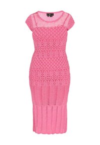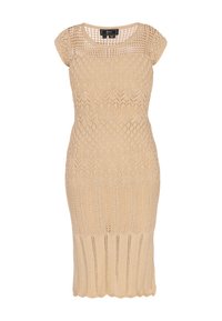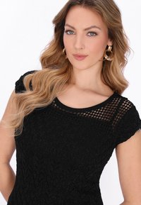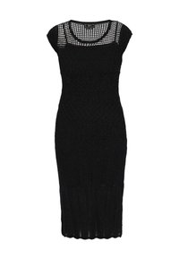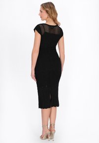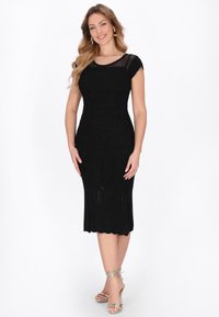 Frau mit langem gewelltem Haar, die ein schwarzes gestricktes Midikleid und goldene Riemchenabsätze trägt, steht mit den Händen hinter dem Rücken vor einem weißen Hintergrund.