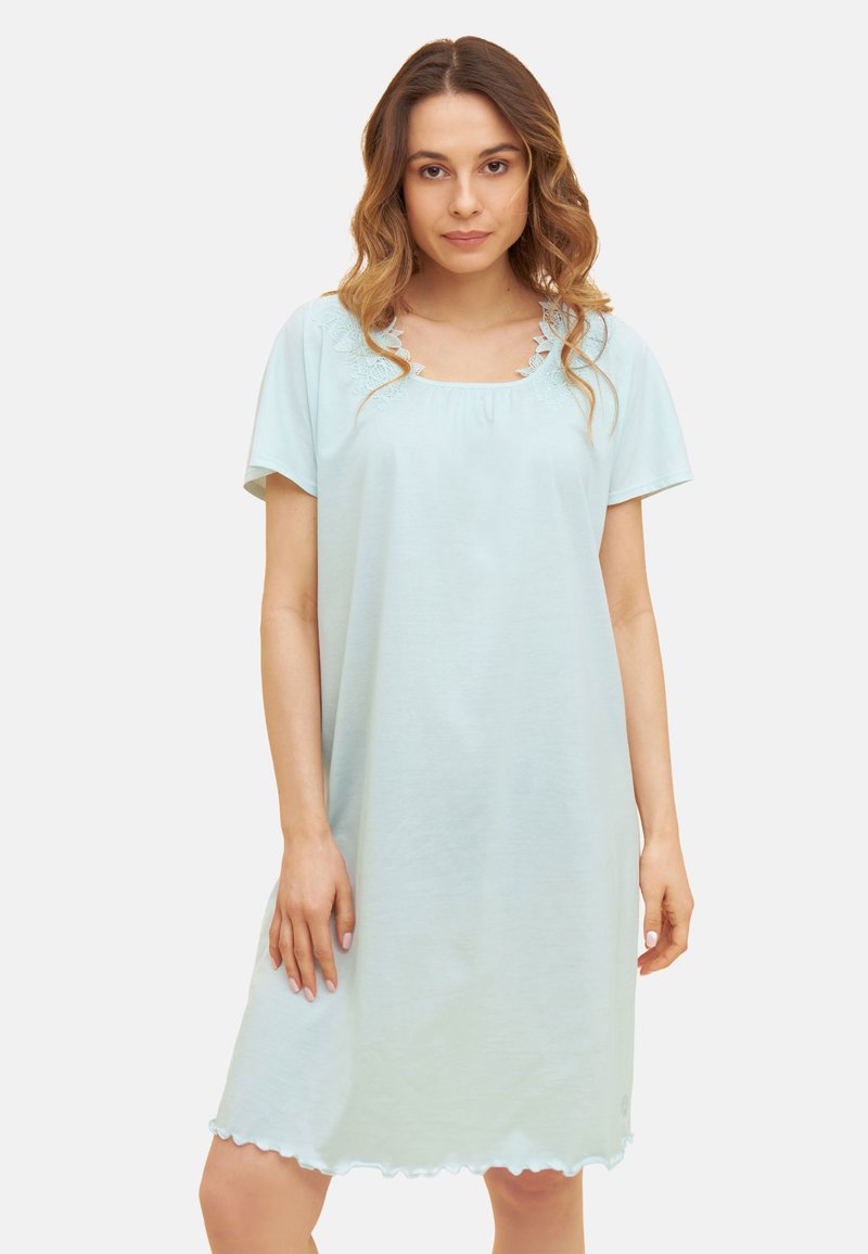 Hellblaues Nachthemd aus weichem Stoff, mit einem Wellensaum am Ausschnitt und Saum, kurzen Ärmeln und lockerem Sitz für Komfort.