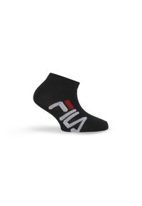 Weiße Knöchelsocken mit einem schwarzen "FILA"-Logo und roten Akzenten. Das Material wirkt weich und hat an der Oberseite eine gerippte Strickstruktur.