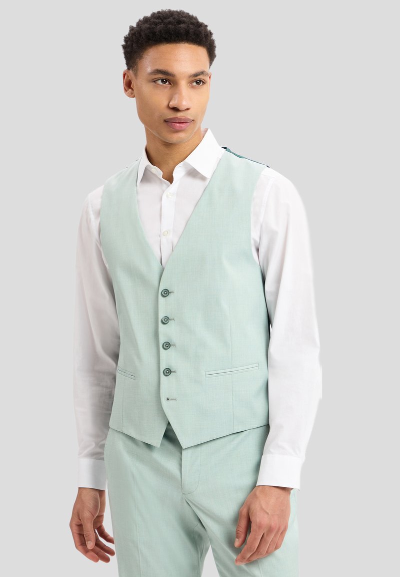 Hellgrüner Weste aus strukturiertem Stoff, mit V-Ausschnitt, fünf Knöpfen und Seitentaschen, kombiniert mit einem weißen Hemd.