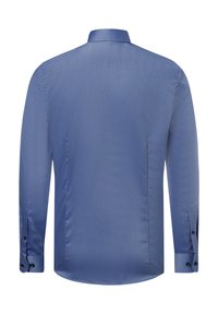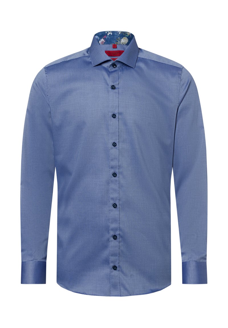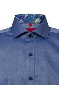 Langarmhemd aus einfarbigem hellblauem Stoff mit einem Kragenfutter im Blumenmuster. Dunkelblaue Knöpfe entlang der Front. Glatte Textur.