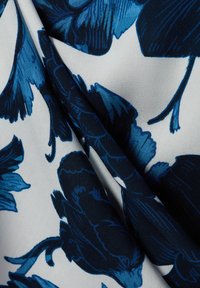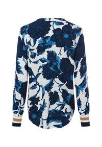 Bluse mit Blumenmuster in Marineblau und Weiß, mit langen Ärmeln, V-Ausschnitt und gerippten Bündchen, akzentuiert mit Gold- und Marineblau-Tönen.