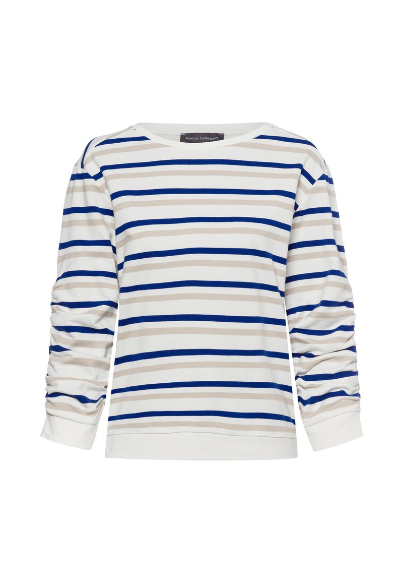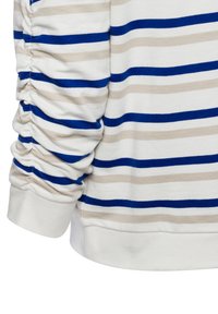 Gestreiftes Langarmshirt in Weiß mit hellbeigen und blauen horizontalen Linien. Hat einen weiten Ausschnitt und geraffte Details an den Ärmeln.