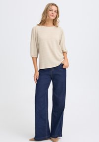 Beige karierte Bluse mit Dreiviertelärmeln, Rundhalsausschnitt und weicher Textur; kombiniert mit dunkelblauen Jeans.