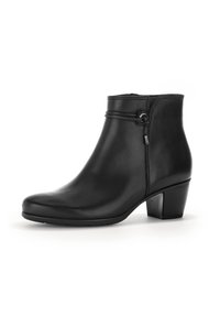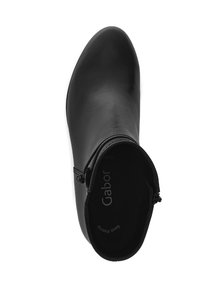 Schwarze Lederknöchelstiefel mit runder Zehenpartie, niedrigem Blockabsatz und dekorativem Seitenriemen. Glatte Textur, schlichtes und elegantes Design.