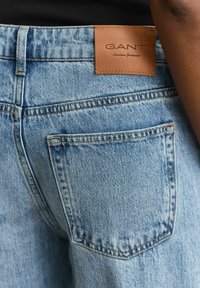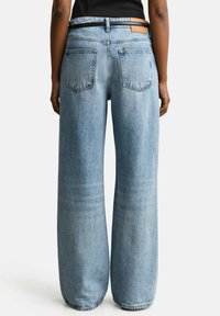 Person trägt hellblaue Jeans mit weitem Bein, schwarzen Gürtel und hellbraune Wildleder-Spitzenschuhe und steht vor einem schlichten Hintergrund.