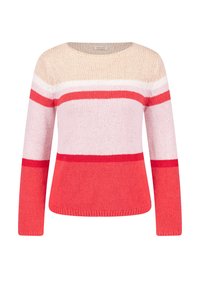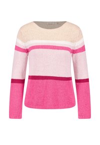 Strickpullover mit horizontalen Streifen in den Farbtönen Pink, Creme und Burgunderrot. Rundhals und lange Ärmel mit gerippten Bündchen.