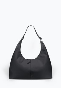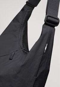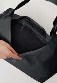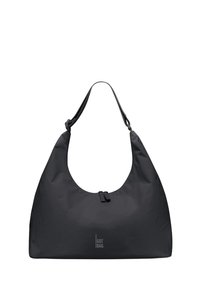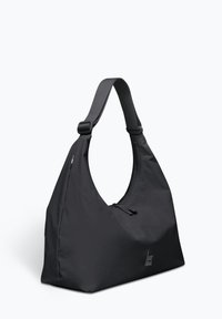 Frau trägt ein weißes Langarmshirt und graue Jeans, hält eine große schwarze Umhängetasche mit der Aufschrift "GOT BAG", lächelt und ist seitlich zu sehen.