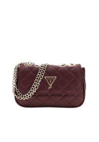 Gestepptes schwarzes Handtasche mit einem dreieckigen goldenen Logo-Plakette, goldener Kettenriemen und glatter Textur, mit einem Klappenverschluss.