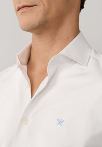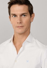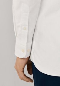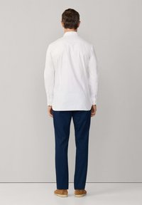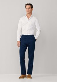 Mann trägt ein eng anliegendes weißes Hemd mit Knöpfen, das in dunkelblaue Hosen gesteckt ist, steht mit einer Hand in der Tasche vor einem einfarbigen Hintergrund.