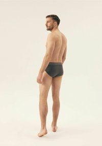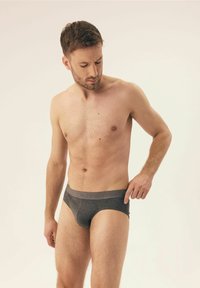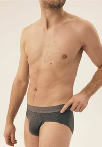 Graue Baumwollslips mit einem taillierten Design, elastischem Bund und glatter Textur, getragen von einem Modell, das mit einer Hand auf dem Bund steht.