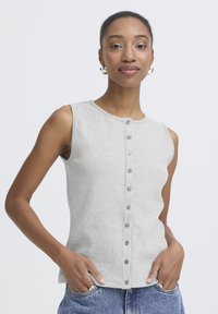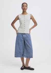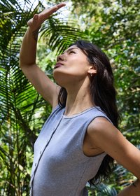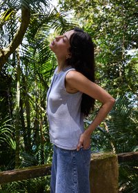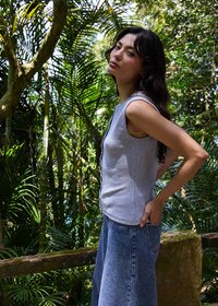 Frau mit langen dunklen Haaren, die ein ärmelloses graues Oberteil mit Knöpfen und blaue Jeans trägt, steht draußen an einem moosbewachsenen Stein-Geländer mit Bäumen im Hintergrund.