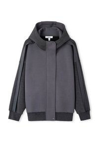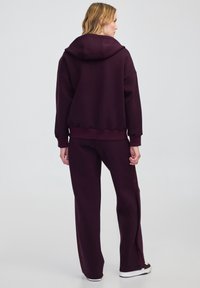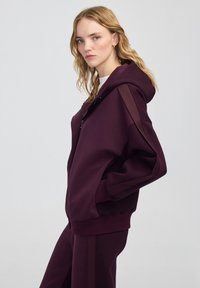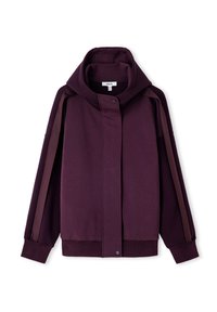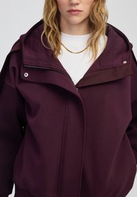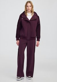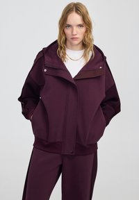 Bordeauxroter Oversize-Blouson mit Reißverschluss vorne, weiter Kapuze und Seitentaschen. Weicher Stoff mit glatter Textur, kombiniert mit passenden Hosen.
