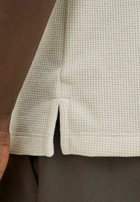 Beige Polo-Shirt mit einer strukturierten Stoffqualität, ausgestattet mit einer Drei-Knopf-Leiste und einem weichen Kragen. Das Material hat ein dezentes Rautenmuster.