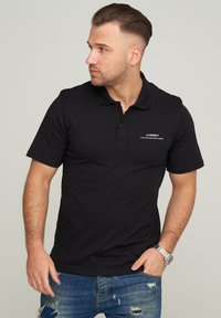 Weißes Polohemd mit einer Knopfleiste mit zwei Knöpfen, kurzen Ärmeln und einem kleinen schwarzen Logo auf der linken Brust. Glatte Baumwolltextur.
