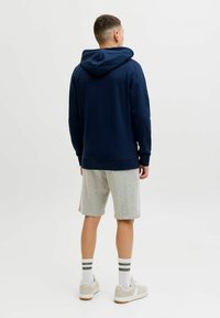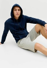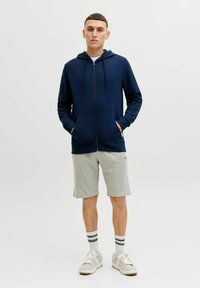 Mann trägt graue Jack & Jones Shorts, weiße Socken mit zwei dunkelgrünen Streifen, hellbeige Sneaker und eine marineblaue Zip-up-Jacke.