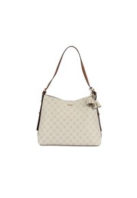 Schwarze Schultertasche aus synthetischem Material mit geschwungenem oberen Rand, goldenem Logo und dekorativen Quastenakzenten.