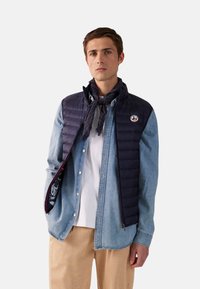 Junger Mann, der eine marineblaue gesteppte Weste über einem hellen Jeanshemd, einem weißen T-Shirt, beigen Hosen und einem dunklen Schal trägt, der um seinen Hals gebunden ist.
